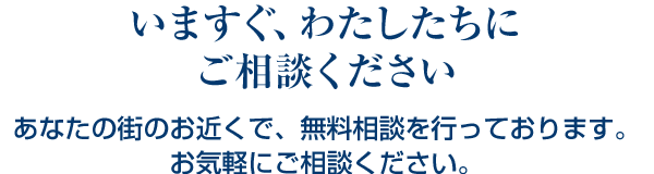 土曜・祝日も無料相談あなたの街のお近くの店舗で、土曜・祝日も無料相談を行っております。お気軽にご相談ください。