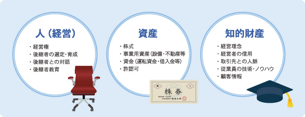 経営権を引き継ぐ「人(経営)」の承継、自社株式・事業用資産、 債権や債務など「資産」の承継、経営理念や取引先との人脈、技術・技能といった「知的資産」の承継を、計画的に着実に進めていく体制づくりが必要不可欠です。