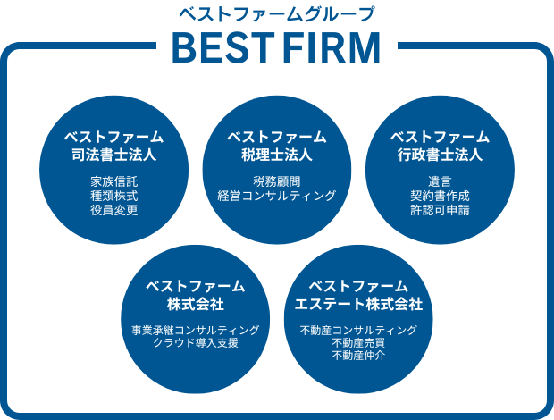 ベストファームグループには、税理士、司法書士、行政書士等の国家資格者が在籍。事業承継に関する様々な問題に対して、相続対策ノウハウ等のそれぞれの分野の知見を駆使し、顧問税理士や株主や従業員をはじめとしたステークホルダーと連携して、実現可能な事業承継の計画策定から円滑な実行までをサポートいたします。