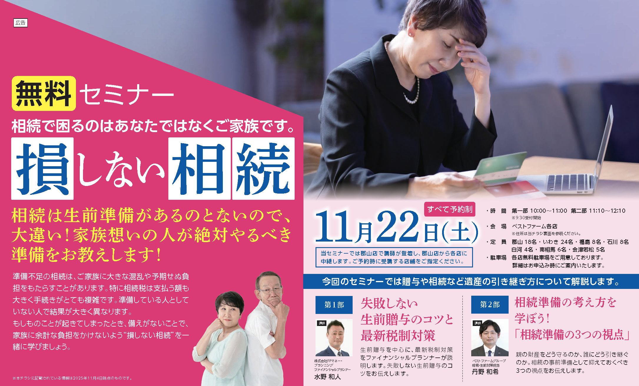 | 内容 | 第一部 失敗しない生前贈与のコツと最新税制対策 第二部 相続準備の考え方を学ぼう!「相続準備の3つの視点」 |