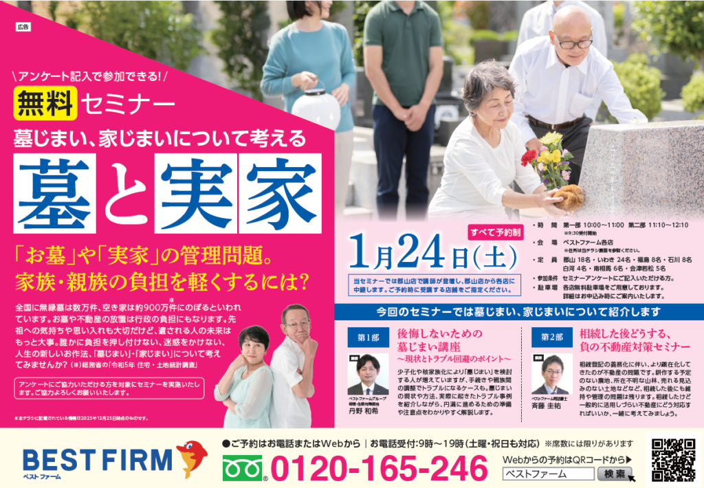 | 内容 | 第一部 後悔しないための墓じまい講座~現状とトラブル回避のポイント~ 第二部 相続した後どうする、負の不動産対策セミナー |